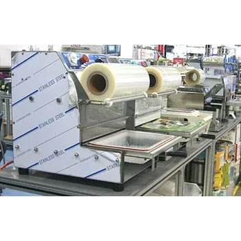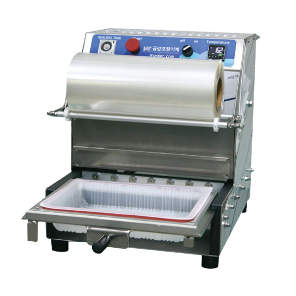 풋 스위치를 누르고 있으면 실링이 컨트롤 박스에서 설정한 만큼 머무르고 올라간다, 칼로 옆의용기와 이어져있는 필름을 자른 후 먼저 포장된 우측의 몰드에서 포장물을 꺼낸 후 반복 작업을 한다.(일자 컷팅용 칼날이 장착된 모델도 있음)