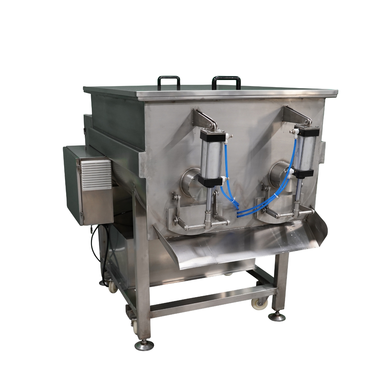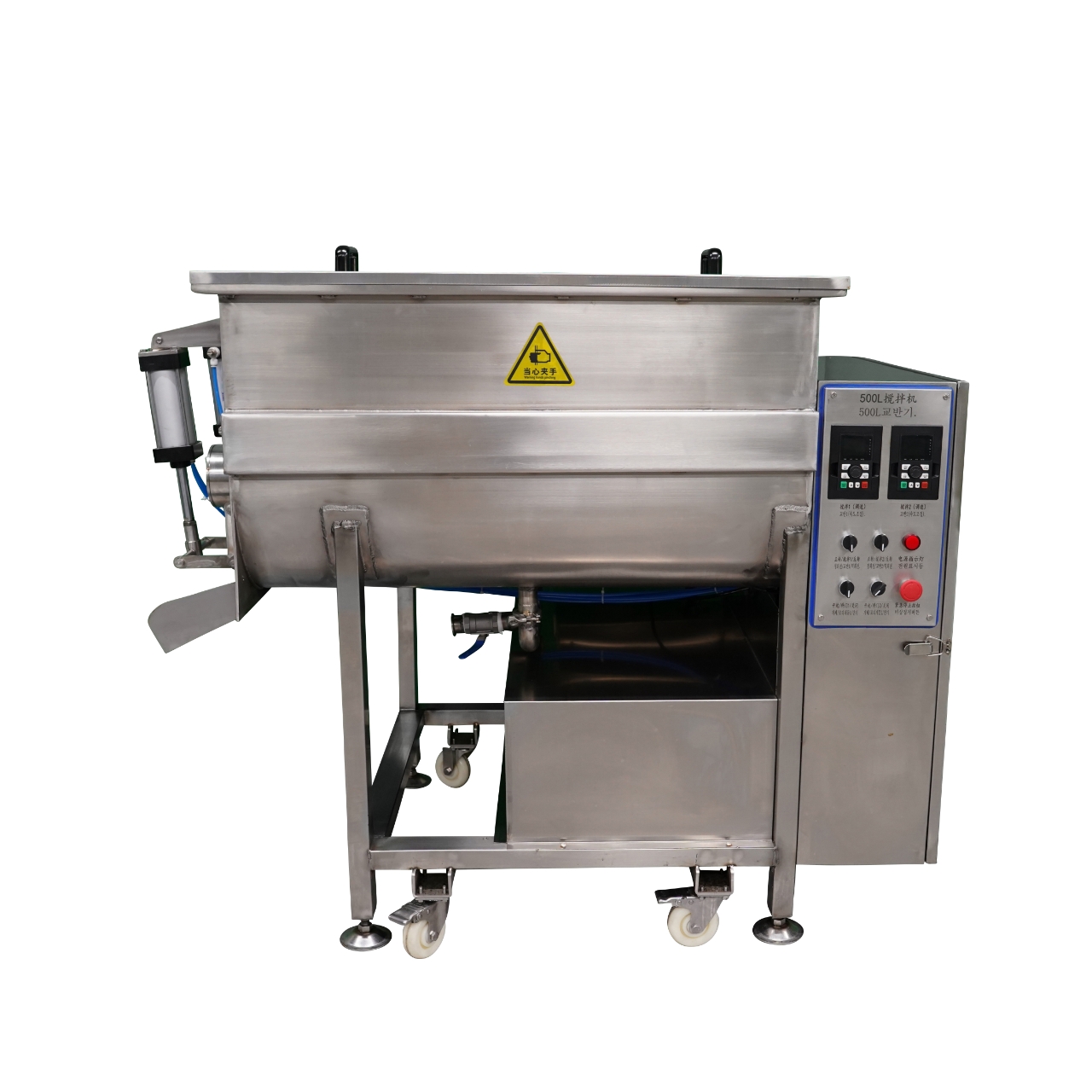 스테인레스(sus304)로 제작되어 내식성이 뛰어나, 식품산업에 안전하게 사용할 수 있는 식품교반기, 혼합기로 200리터의 용량으로 식재료를 한번에 교반, 혼합 처리할 수 있습니다.