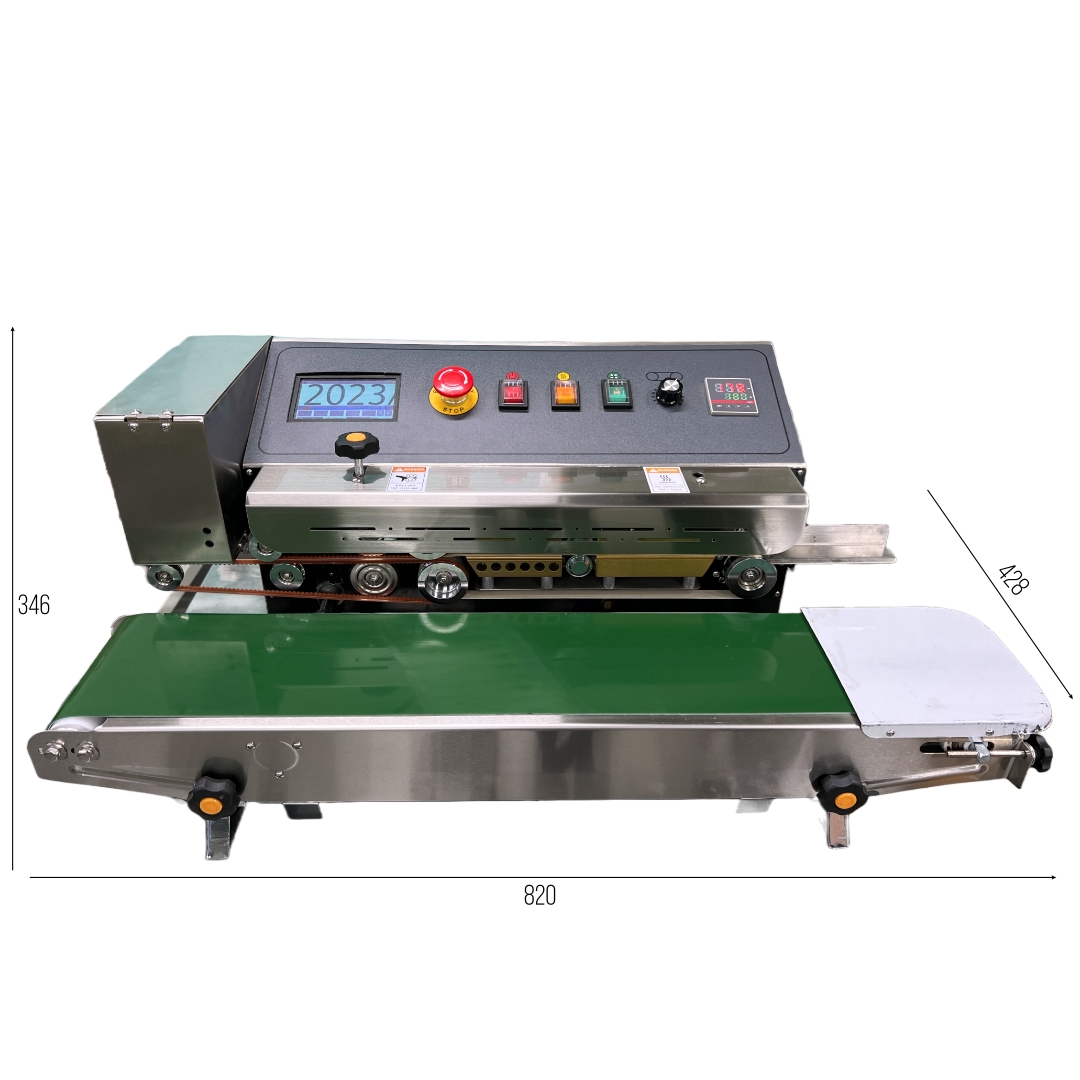 탁상형 밴드실러 시리즈는 자동접착(실링기)과 잉크젯 날인(숫자나 유통기한, 제조일자, 소비기한등) 기능이 동시에 작업되는 소형 실링기계이다.